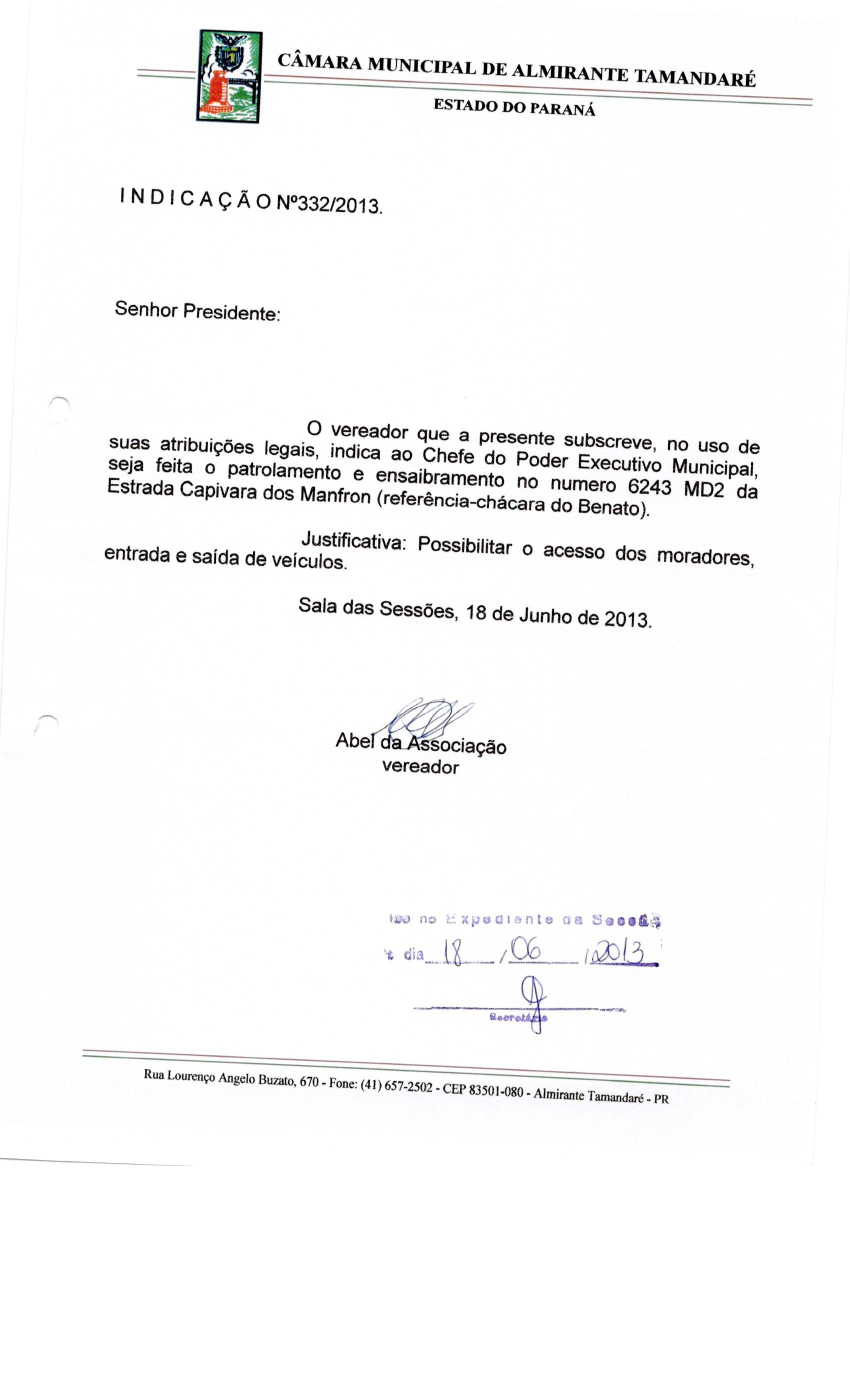 INDICA PATROL.ENSAIBRAMENTO NO N°6243 MD2 DA ESTRADA CAPIVARA DOS MANFRON.