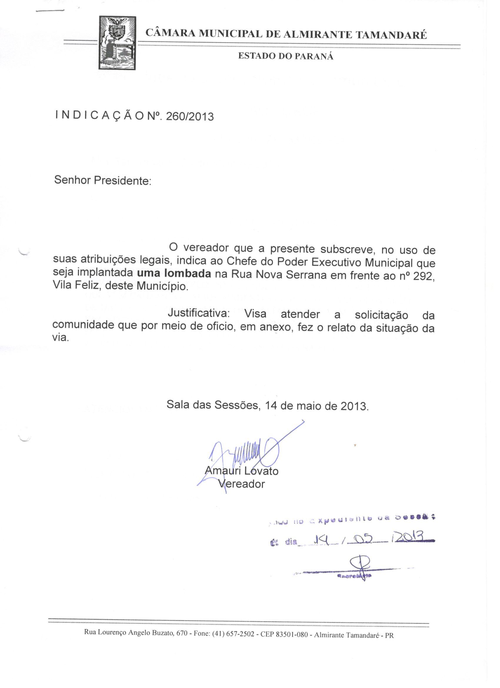 Ementa: INDICA AO CHEFE DO PODER EXECUTIVO, QUE SEJA IMPLANTADA UMA LOMBADA NA RUA NOVA SERRANA EM FRENTE AO