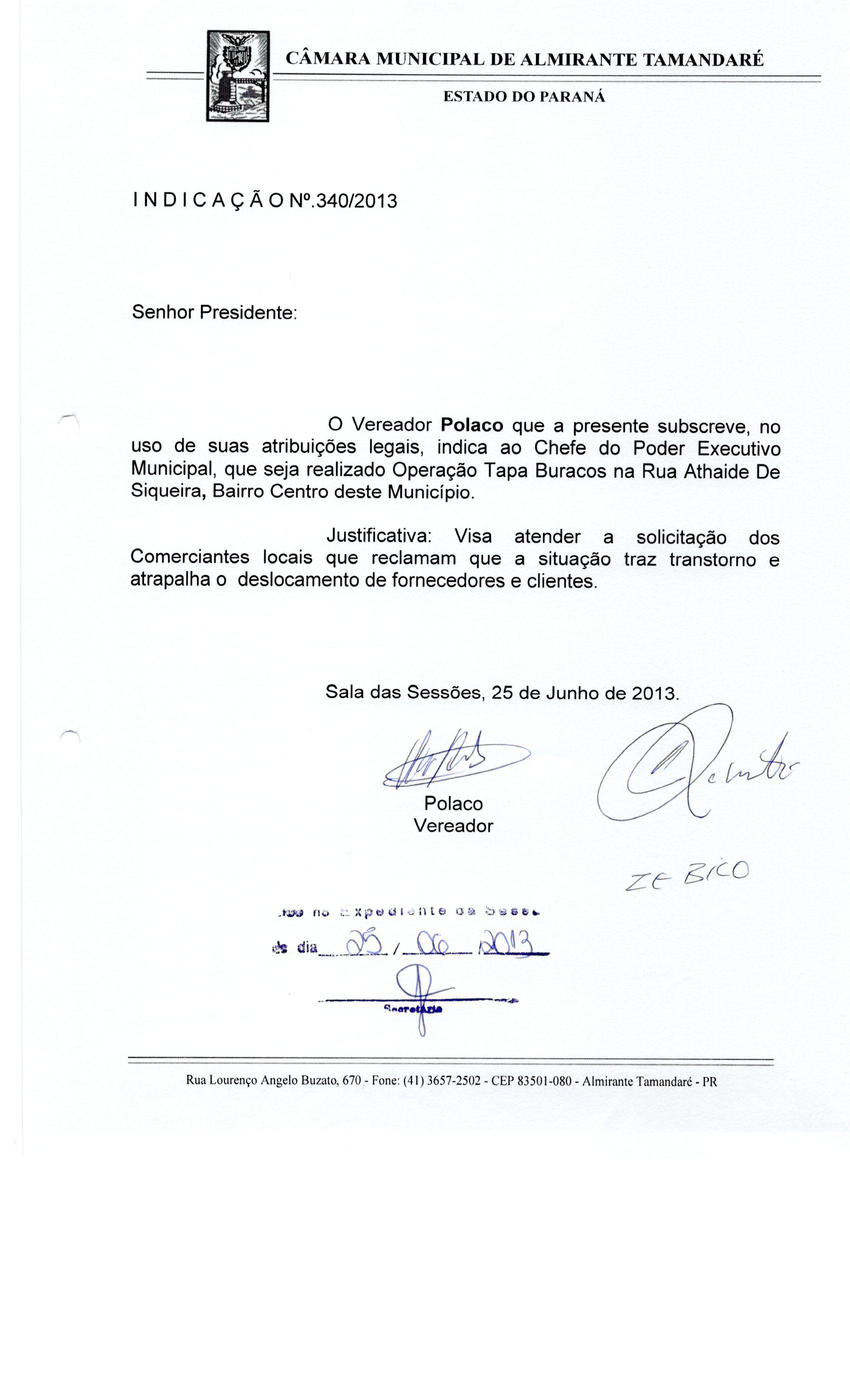 Ementa: INDICA QUE SEJA REALIZADA OPERAÇÃO TAPA BURACOS NA RUA ATHAIDE DE SIQUEIRA BAIRRO CENTRO