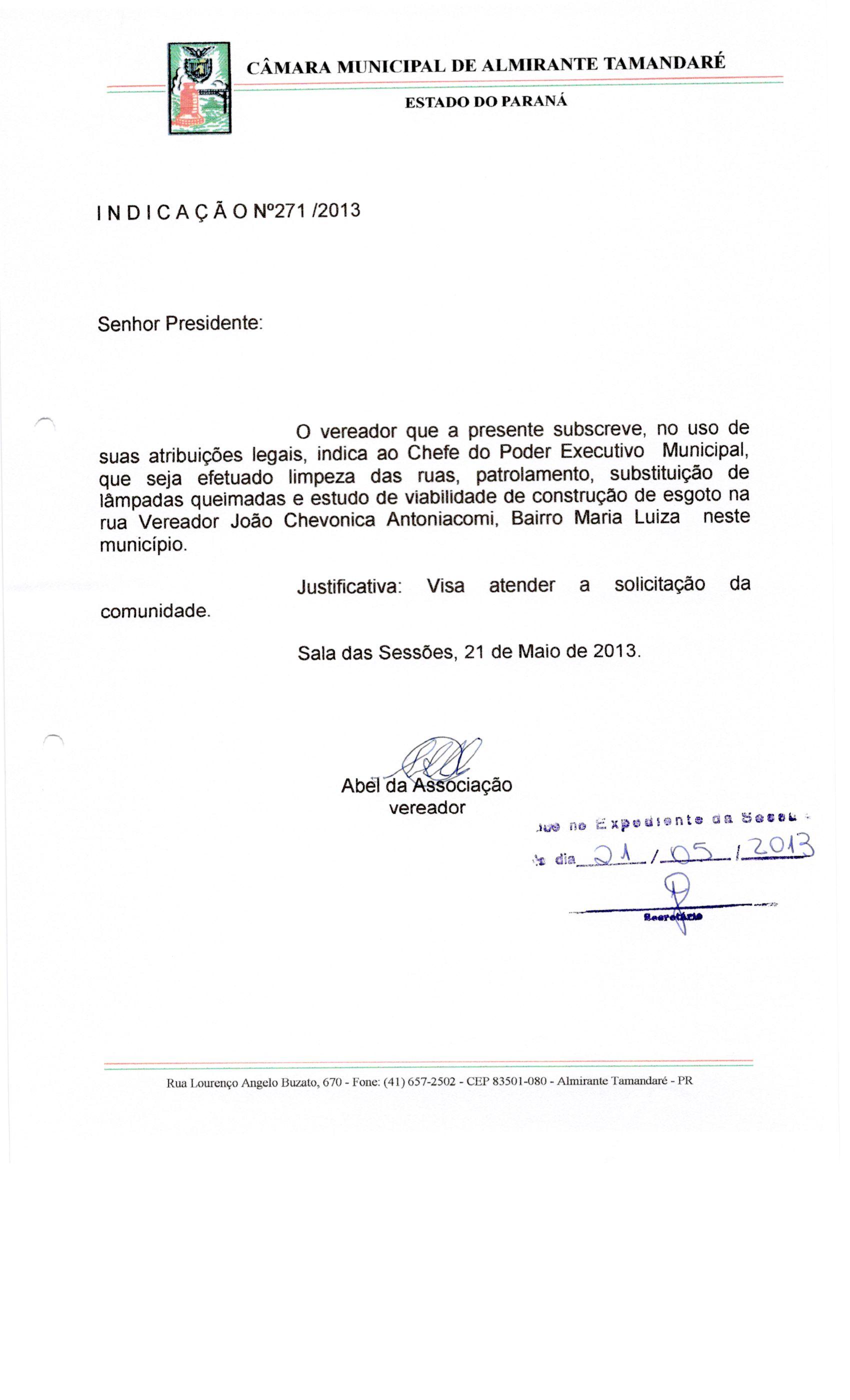 Ementa: INDICA LIMPEZA,PATROLAMENTO,SUBST.DE LÂMPADAS QUEIMADAS...NA RUA JOÃO CHEVÔNICA ANTONIACOMI BAIRRO TRANQUEIRA.