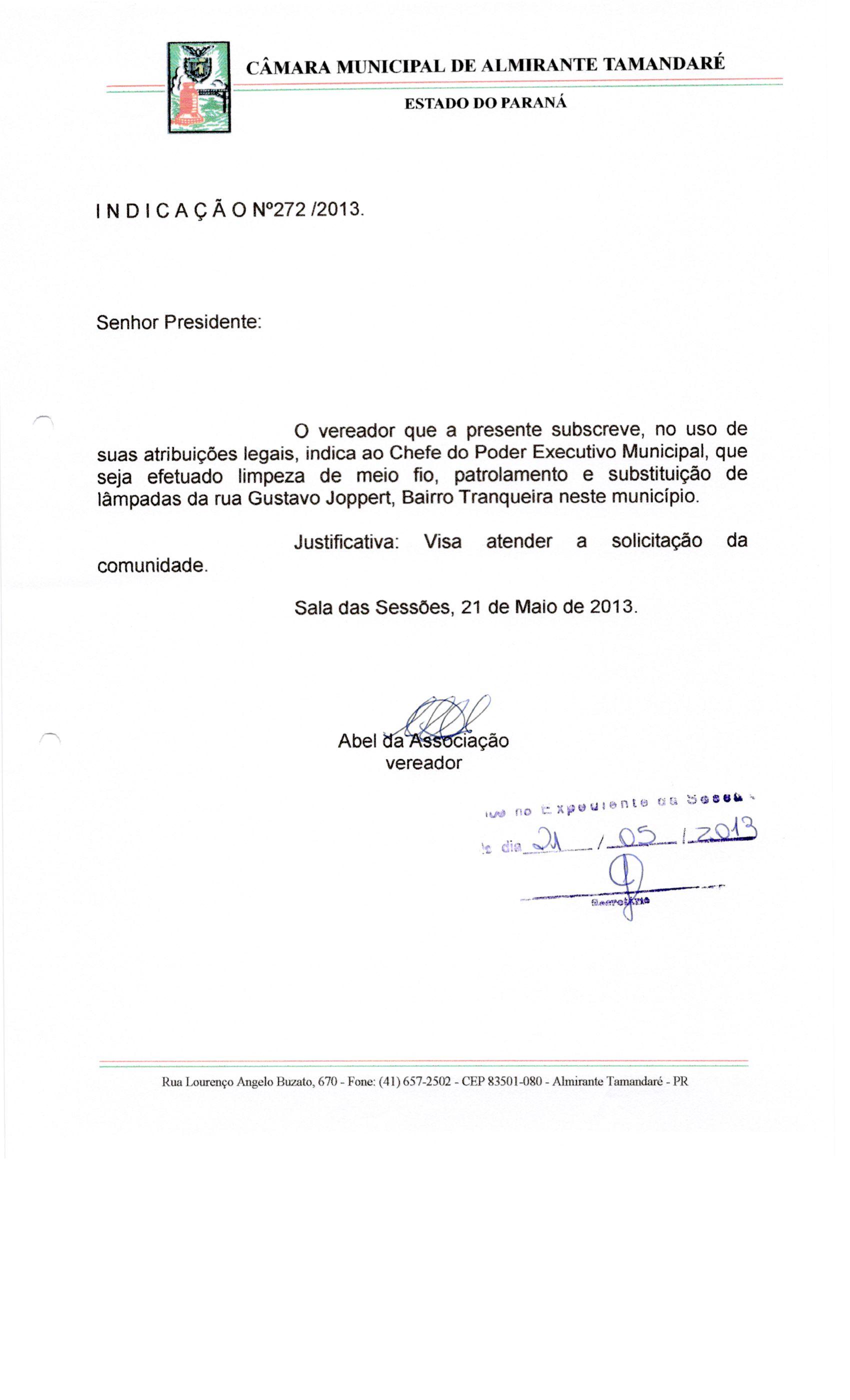 Ementa: INDICA LIMPEZA DE MEIO FIO,PATROLAMENTO E SUBST.DE LÂMPADAS DA RUA GUSTAVO JOPPERT NO BAIRRO TRANQUEIRA.