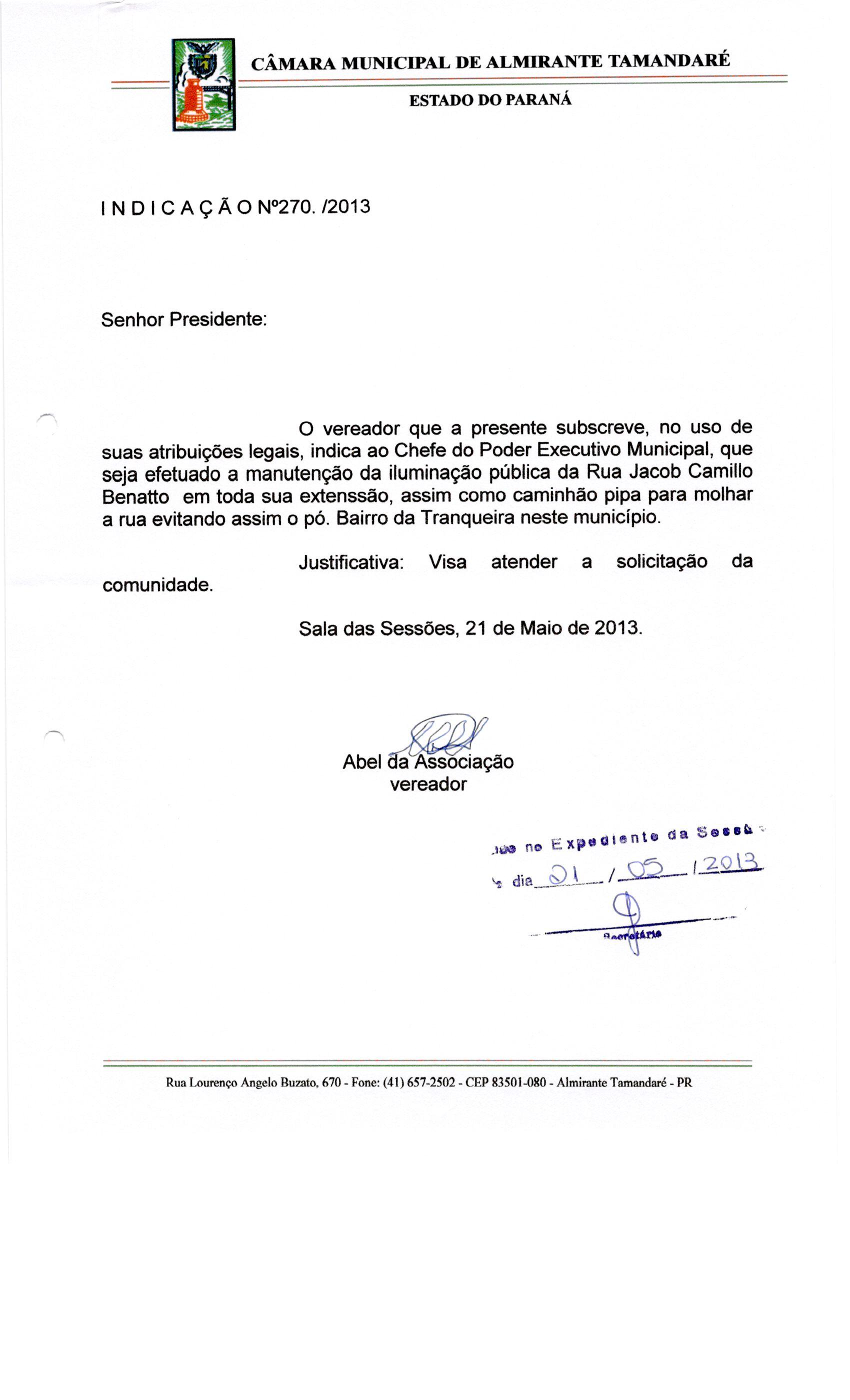 Ementa: INDICA A MANUTENÇÃO DA ILUMINAÇÃO PÚBLICA DA RUA JACOB CAMILLO BENATTO EM TODA SUA EXTENSÃO NO BAIRRO TRANQUEIRA.