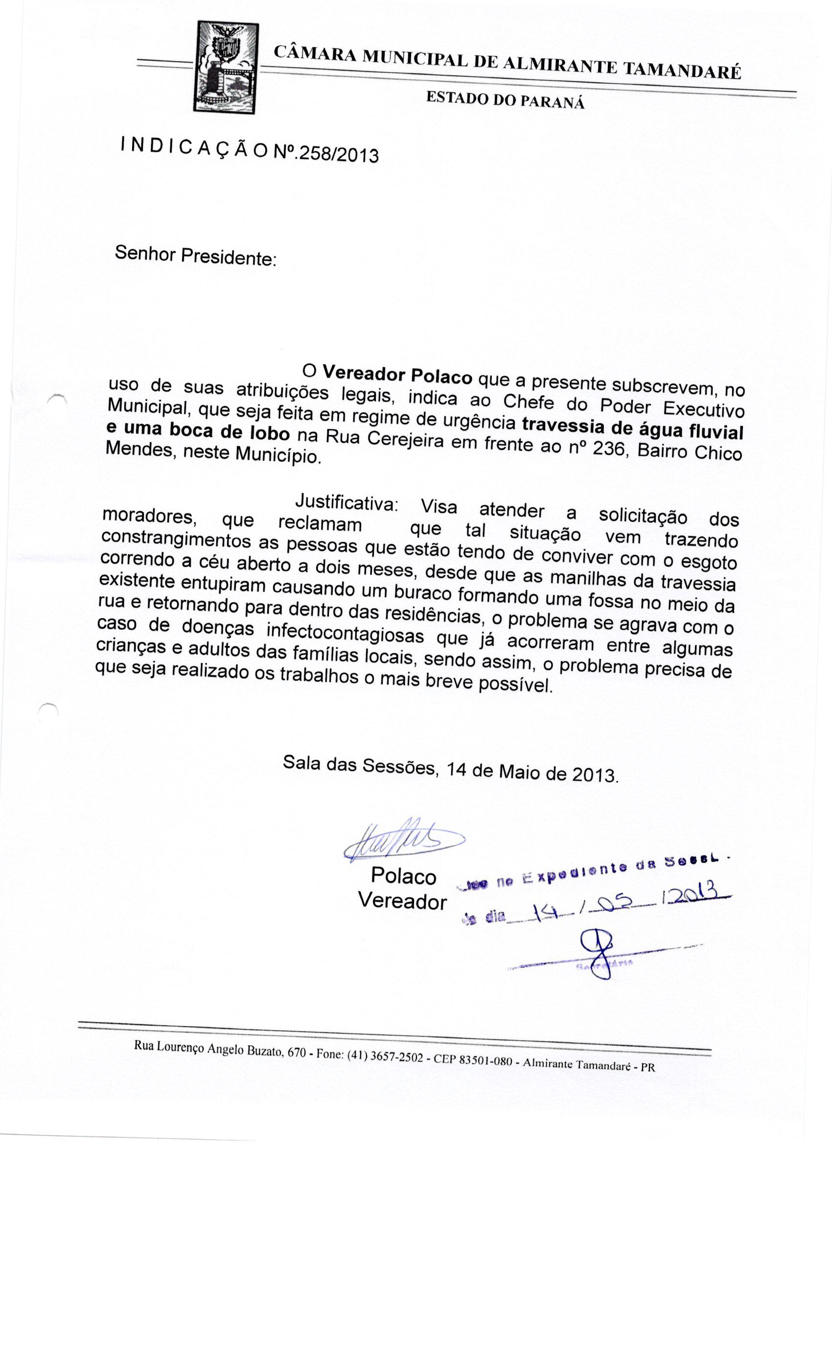 Ementa: INDICA A CONSTRUÇÃO DE UMA TRAVESSIA DE ÁGUA PLUVIAL E UMA BOCA DE LOBO NO Nº236 DA RUA CEREJEIRAS BAIRRO CHICO MENDES.