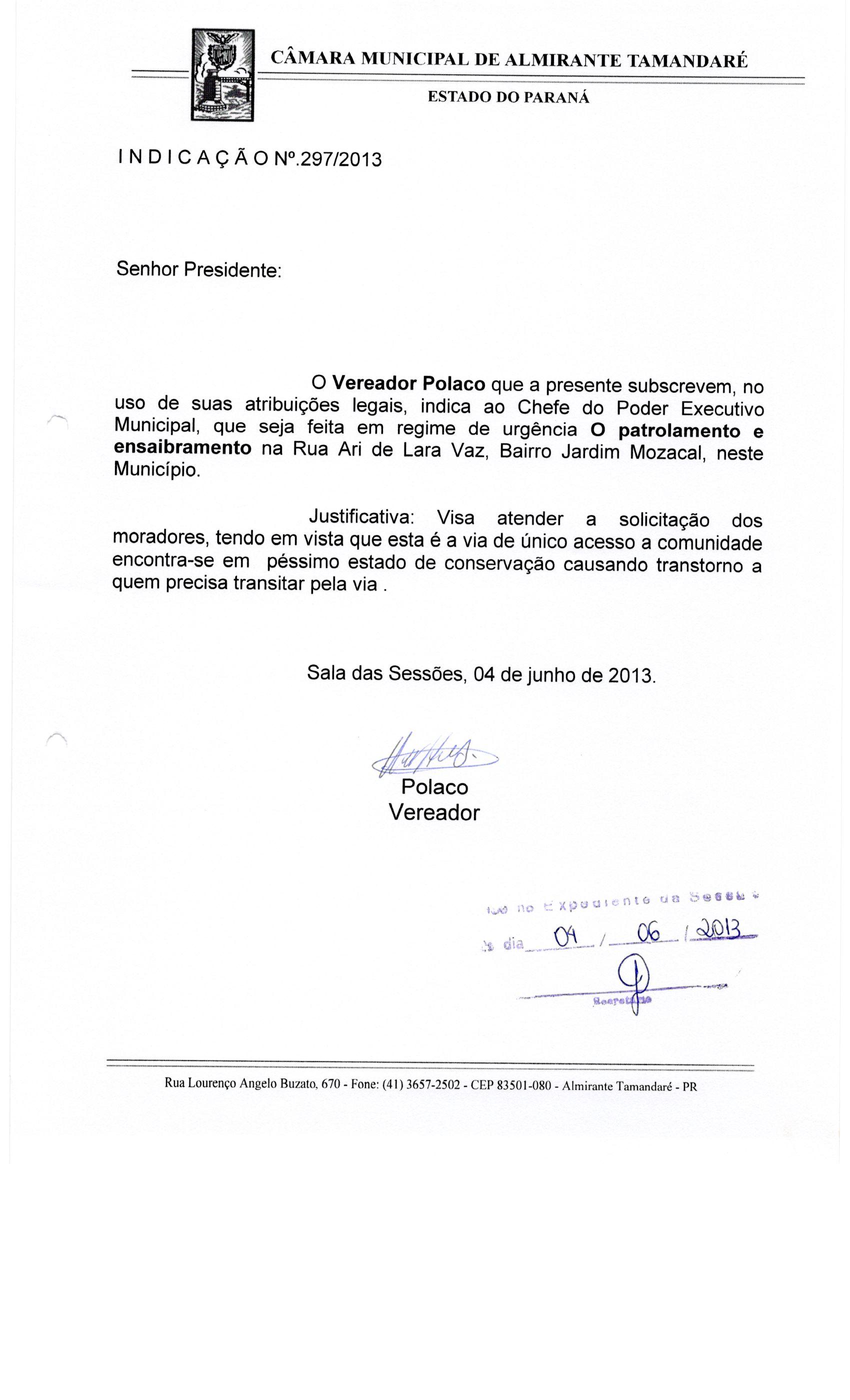 Ementa: INDICA PATROLAMENTO,ENSAIBRAMENTO E ILUMINAÇÃO PÚBLICA DA RUA ARI DE LARA VAZ NO BAIRRO MATO DENTRO.