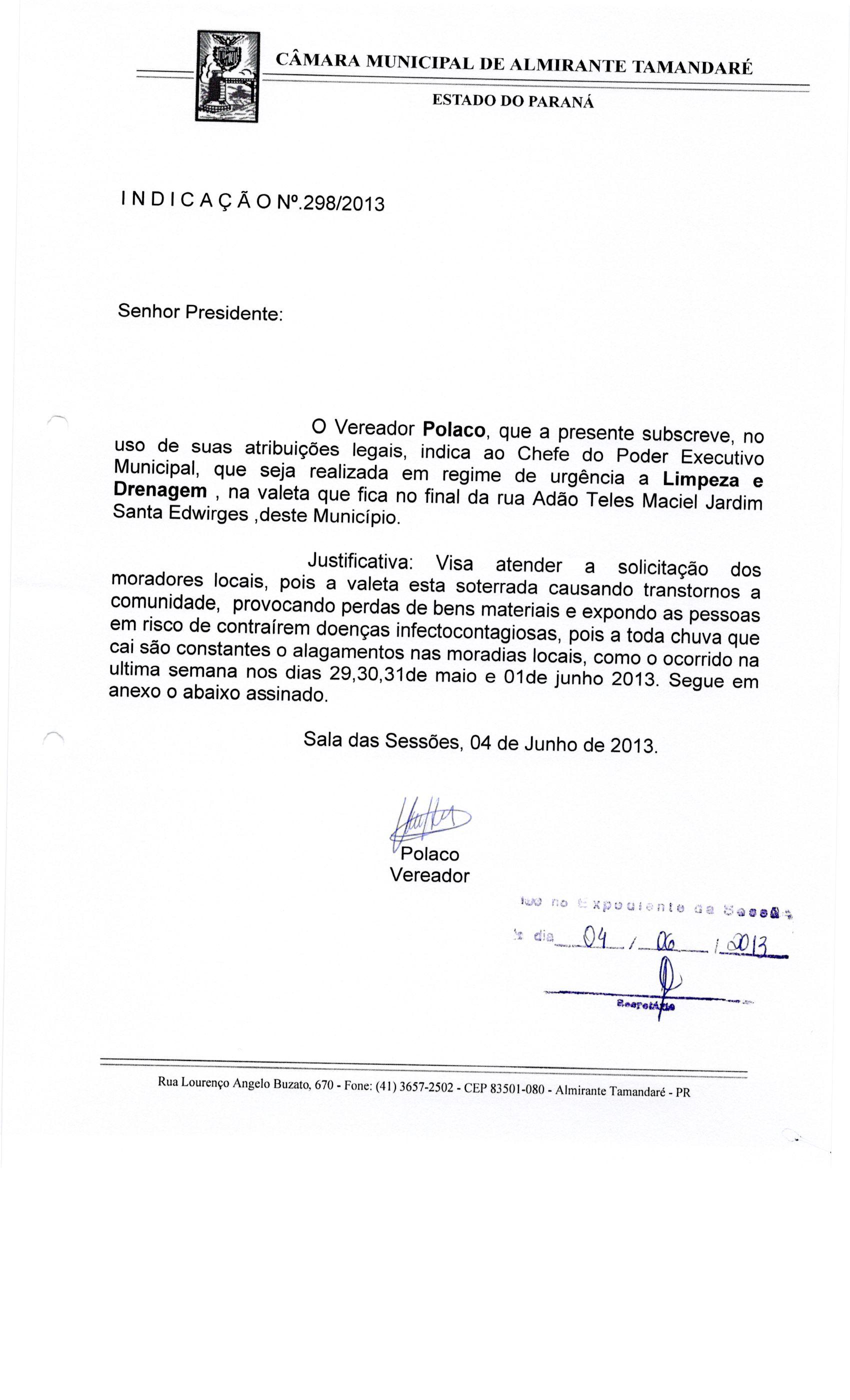 Ementa: INDICA QUE SEJA FEITO O DESASSOREAMENTO DA VALETA NO FINAL DA RUA ADÃO TELES MACIEL JARDIM SANTA EDWIRGERS.