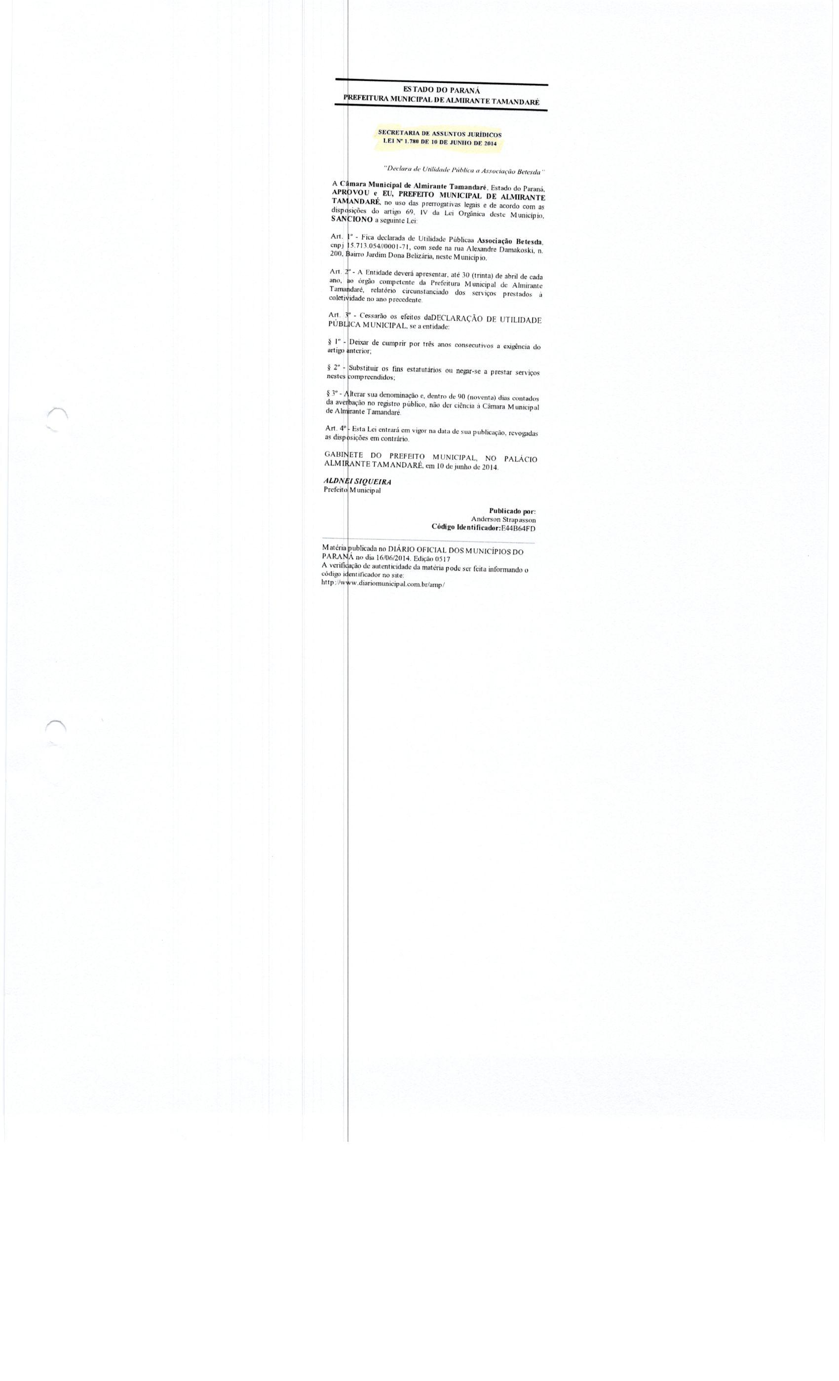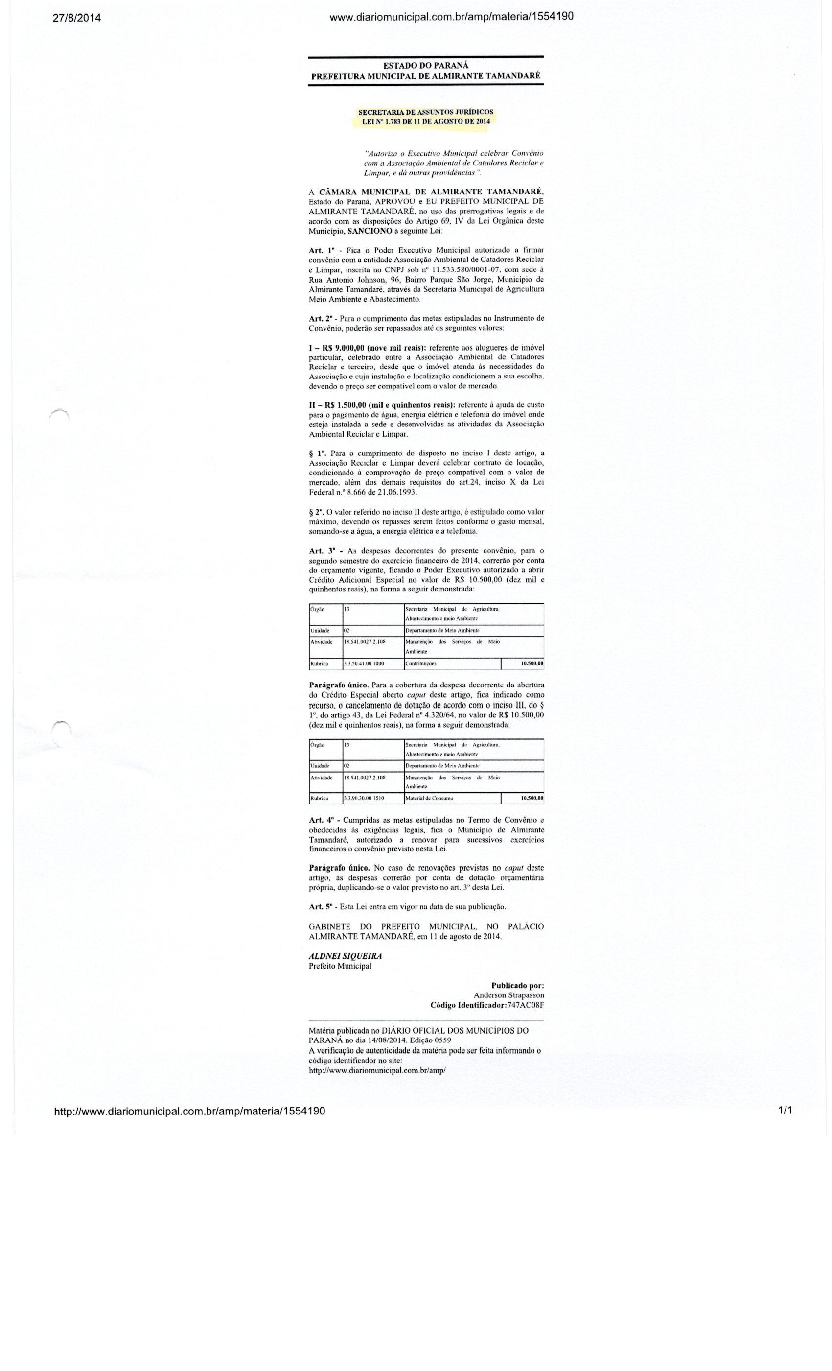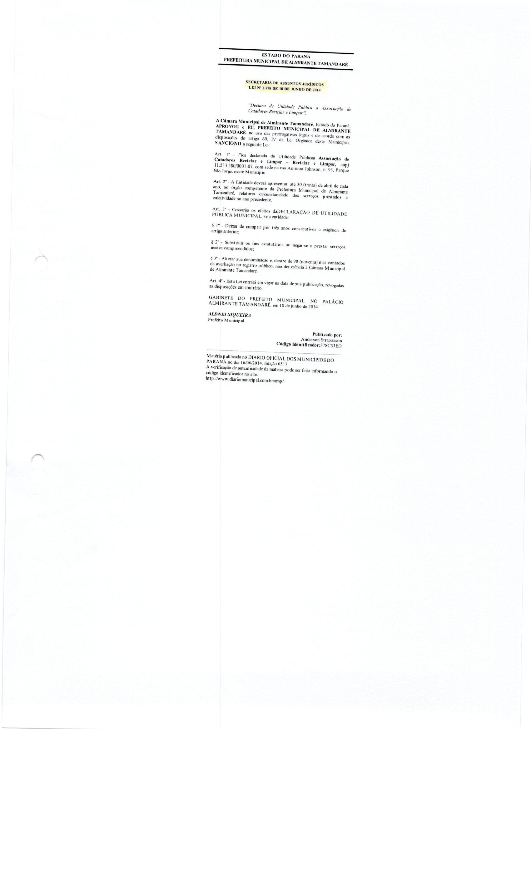 Ementa: DECLARA DE UTILIDADE PÚBLICA A ASSOCIAÇÃO DE CATADORES DE MATERIAL RECICLÁVEL DE ALMIRANTE TAMANDARÉ Texto Original |