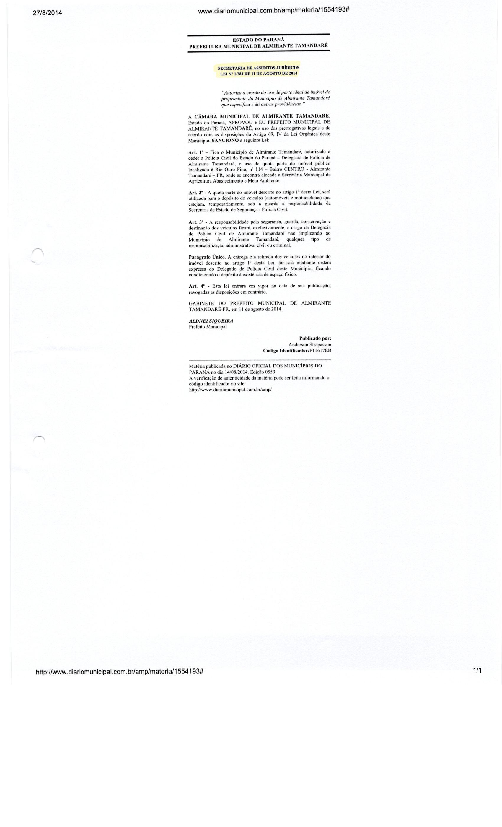 Ementa: INSTITUI O DIÁRIO OFICIAL DOS MUNICÍPIOS DO PARANÁ COMO VEÍCULO OFICIAL DE COMUNICAÇÃO DOS ATOS NORMATIVOS E ADMINISTRATIVOS DE MUNICÍPIO DE ALMIRANTE TAMANDARÉ, E DA OUTRAS PROVIDENCIAS Texto Original |