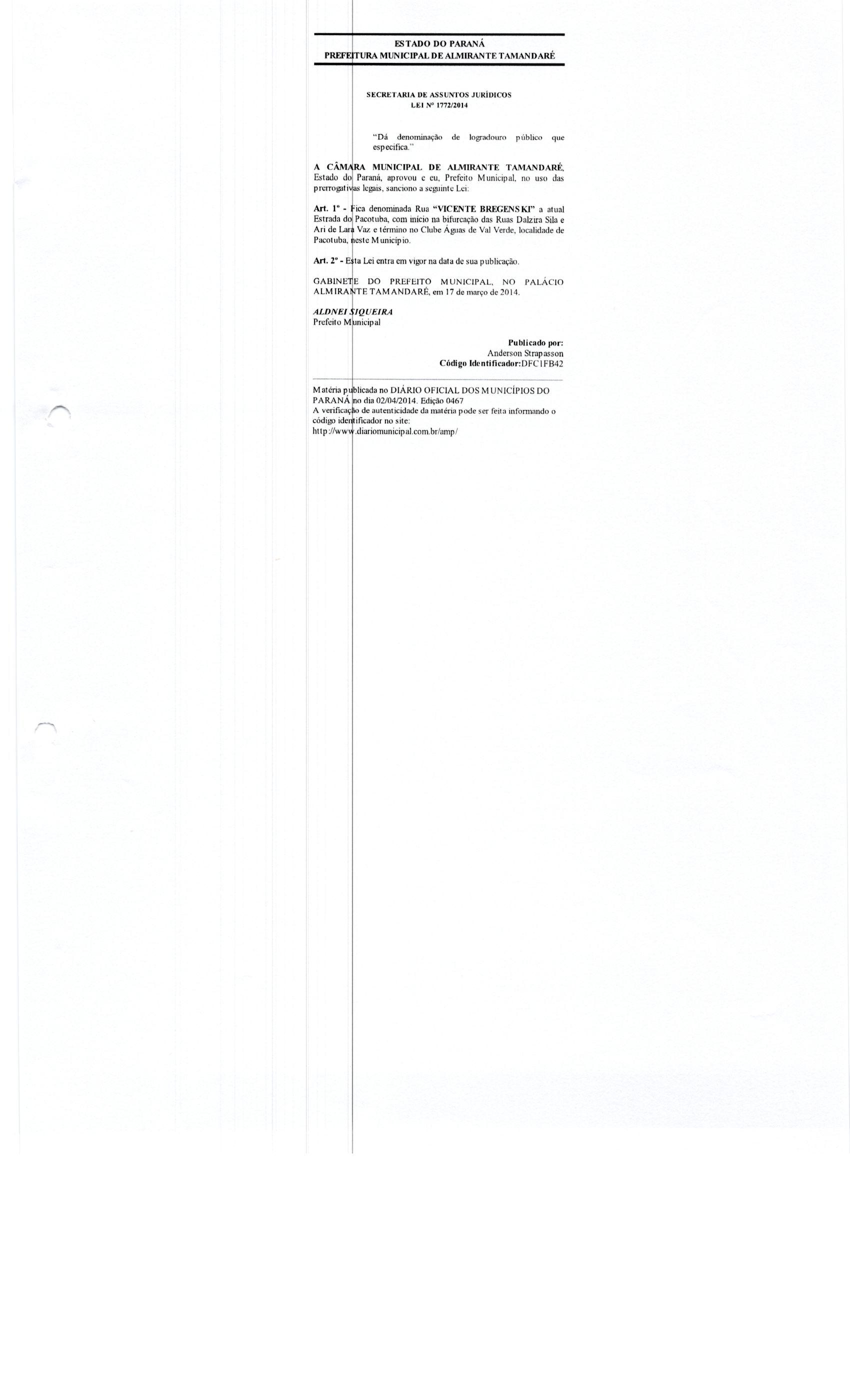 Ementa: DÁ DENOMINAÇÃO DE LOGRADOURO PÚBLICO QUE ESPECIFICA; RUA VICENTE BREGENSKI Texto Original |