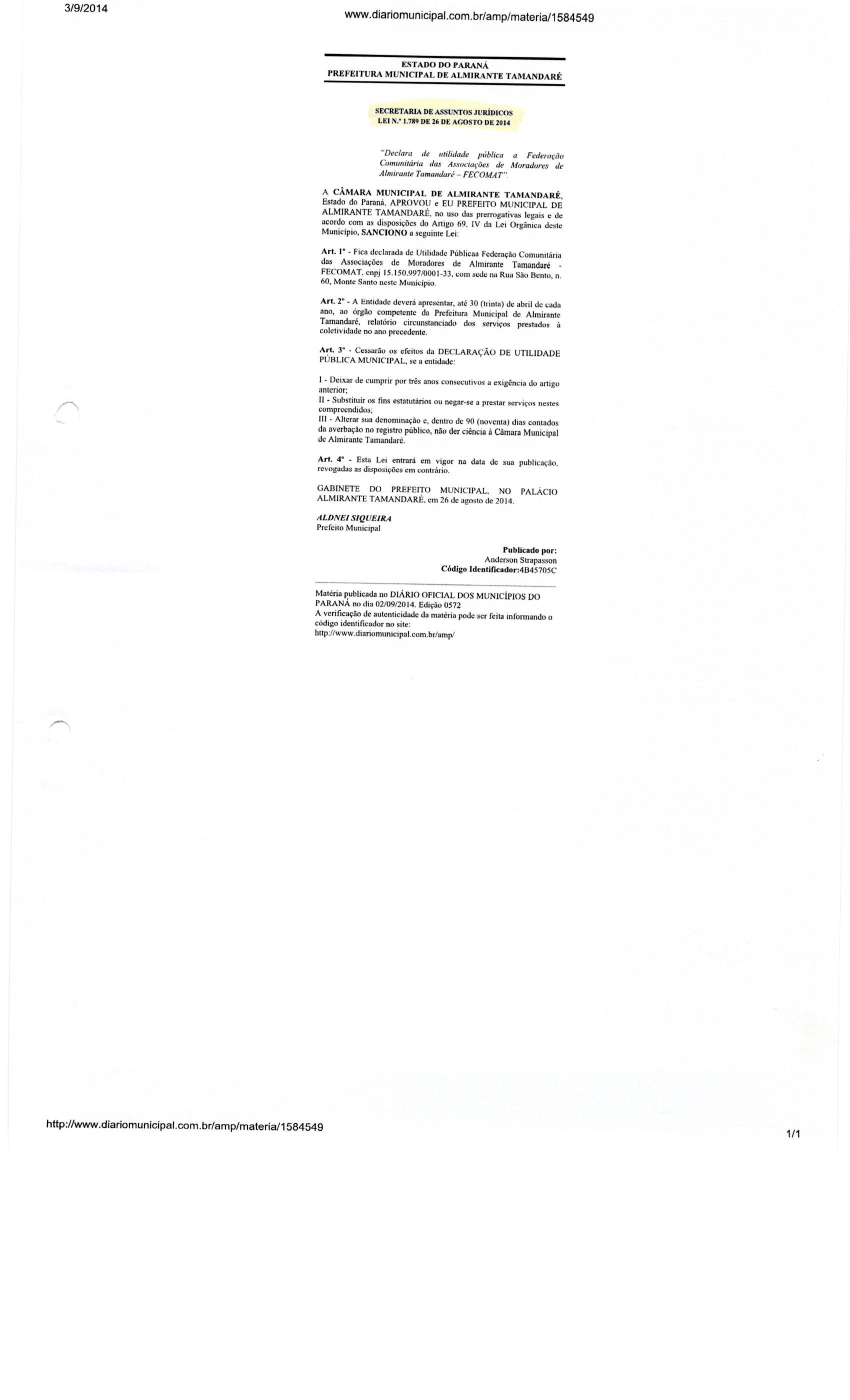 Ementa: DECLARA DE UTILIDADE PÚBLICA A "FEDERAÇÃO COMUNITÁRIA DAS ASSOCIAÇÕES DE MORADORES DE ALMIRANTE TAMANDARÉ - FECOMAT" Texto Original |