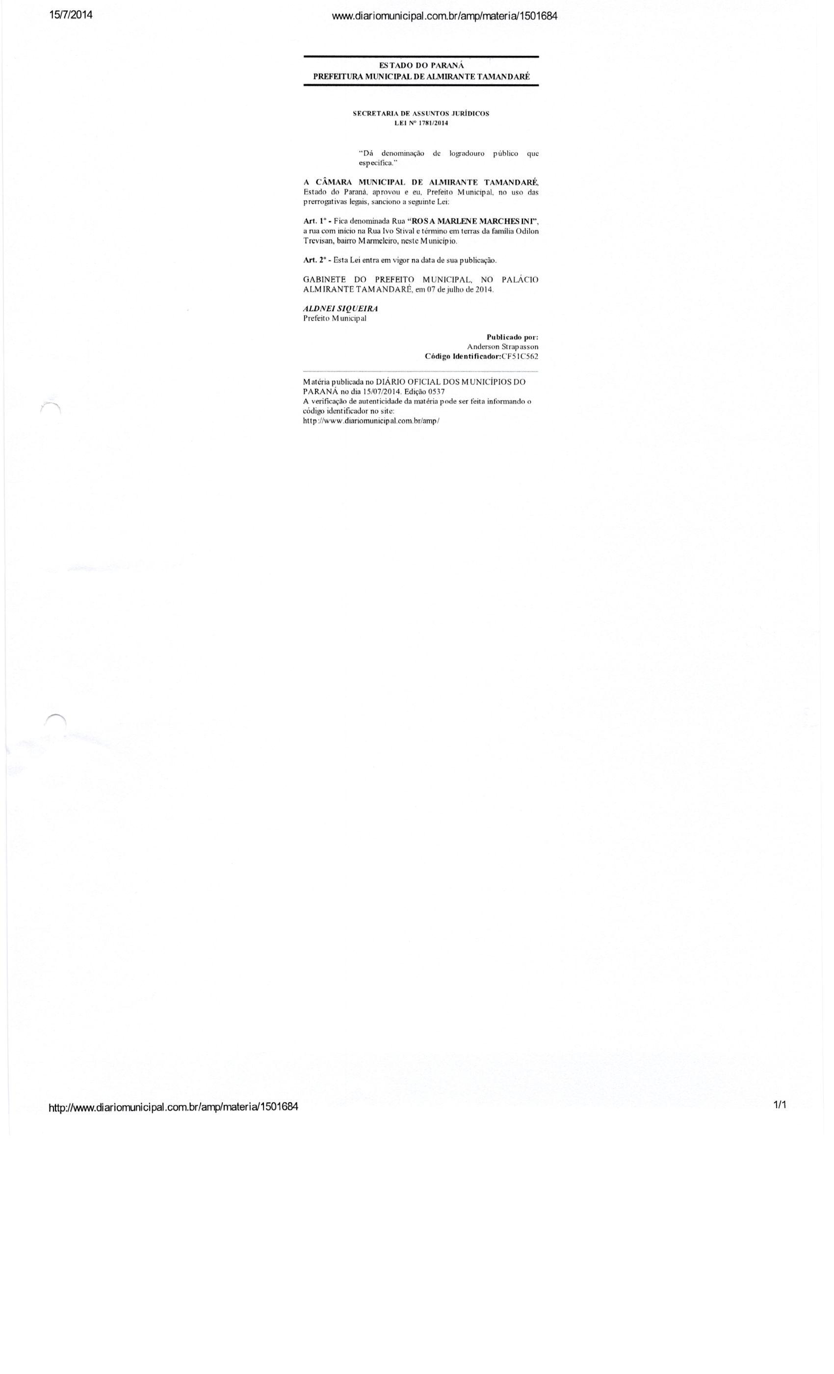 Ementa: "DÁ DENOMINAÇÃO DE LOGRADOURO PÚBLICO QUE ESPECIFICA" RUA ROSA MARLENE MARCHESINI Texto Original |