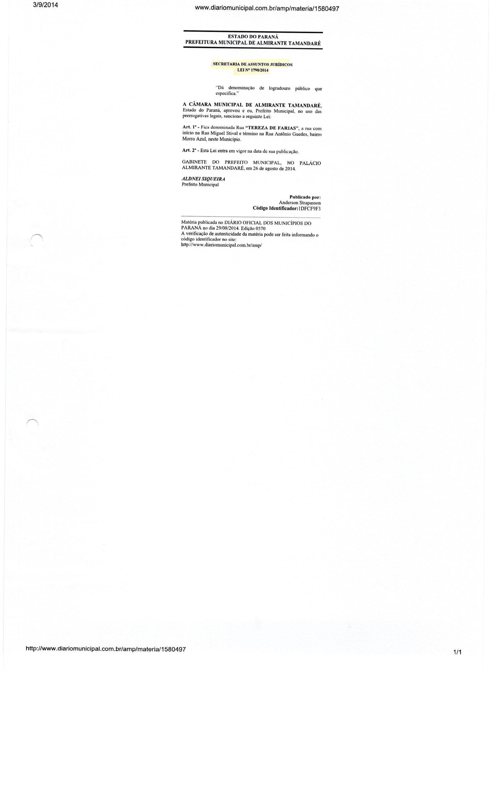 Ementa: "DÁ DENOMINAÇÃO DE LOGRADROURO PÚBLICO QUE ESPECIFICA" RUA TEREZA DE FARIAS Texto Original |